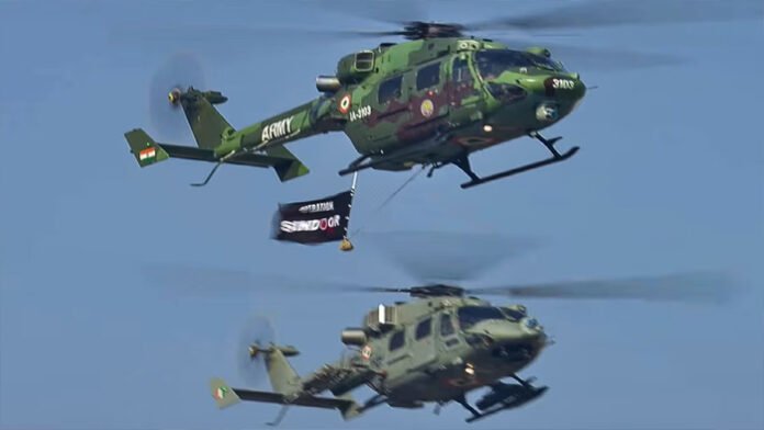 नई दिल्ली। भारत के 77वें गणतंत्र दिवस के अवसर पर कर्तव्य पथ पर राष्ट्रपति द्रौपदी मुर्मू ने सैन्य परेड की सलामी ली। कर्तव्य पथ पर हो रही सैन्य परेड में ऑपरेशन सिंदूर की गूंज साफ नजर आई। परेड के दौरान ध्रुव एडवांस्ड लाइट हेलीकॉप्टर (ALH) पर भारतीय सेना के ऑपरेशन सिंदूर का ध्वज दिखा।